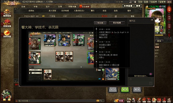 游戏内新增大神直播按钮,方便玩家在游戏之余也可以方便的看到特约主播们的直播三国杀视频。节目单获取直播信息,还可以与主播互动,体验即时乐趣。欢迎大家前来体验~