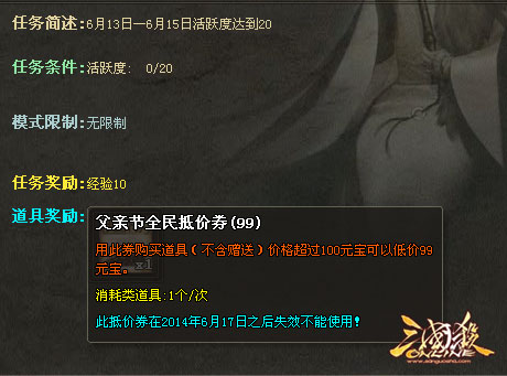 活动奖励:完成活跃度20即可领取父亲节全民抵价券99
