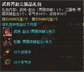 礼包内容:武将-界*赵云1个,标准版-界*赵云1个,手气卡10个,点将卡10个