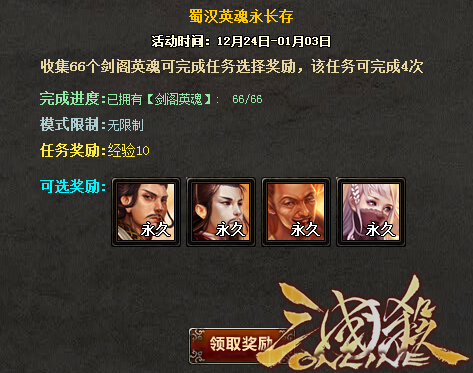 战后宝箱【剑阁宝物】【剑阁礼物】都有机会开出活动道具“剑阁英魂”,消耗一定数量剑阁英魂即可完成活动任务“曹魏英魂永长存”、“蜀汉英魂永长存”兑换剑阁守卫系列武将皮肤。