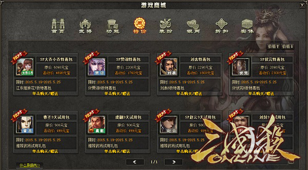 武将曹丕、虞翻、SP赵云、刘封3天试用包,试用包内含相应武将相应3天试用权与此武将的500元宝抵价券(5月31日到期)。