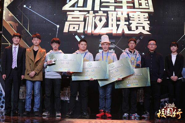 三国杀2015全国高校联赛总决赛结束后,前八名选手均获得《三国杀OL》提供的三国杀地遁的奖励,排名前四的选手更分别获得10000、5000、3000、1000元RMB的比赛奖金、以及武将程昱一年的使用权!其中冠、亚、季军额外获赠三国杀五周年纪念版卡牌!上海乐竞文化传媒副总经理郑夺、三国杀校园行负责人八尺鱼、战旗TV三国杀人气主播冰封、莯小白为总决赛的冠、亚、季、殿军颁奖: