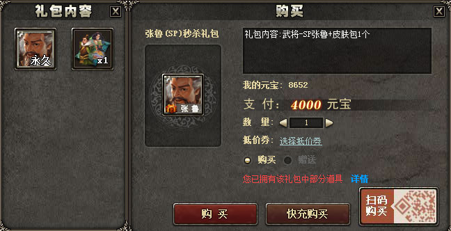礼包名称:张鲁(SP)秒杀礼包