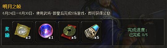 明月之皎:6月24日—6月30日,使用武将-郭皇后完成5场游戏,即可获得手气卡5个、新月光宝盒5个、【原创之魂】1个