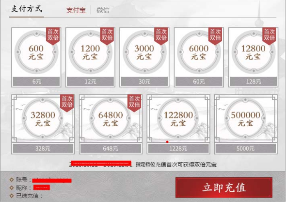 游戏内新增各档位充值包、活动期间在游戏内首次购买指定档位充值包还可享受双倍元宝福利。