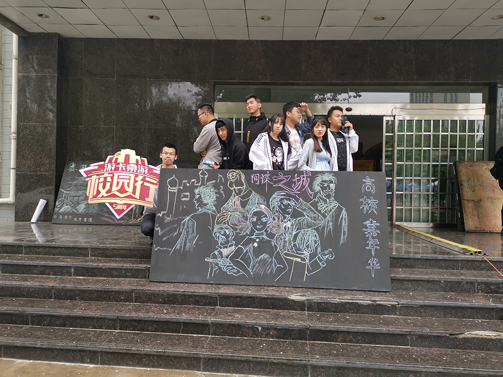 由山西工职的同学们特别设计的黑板,内容包括了校园行五周年、游卡桌游的三国杀、形意棋、间谍之城等产品形象。活动现场还有几名同学直接表演了一段灵魂COS摆拍。