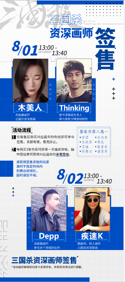 本次CJ现场,我们邀请到了三国杀圈内知名画师:木美人、Thinking、Depp、疾速K来到现场进行签售互动,喜欢他们的主公可以准时来展台区参与画师签售!