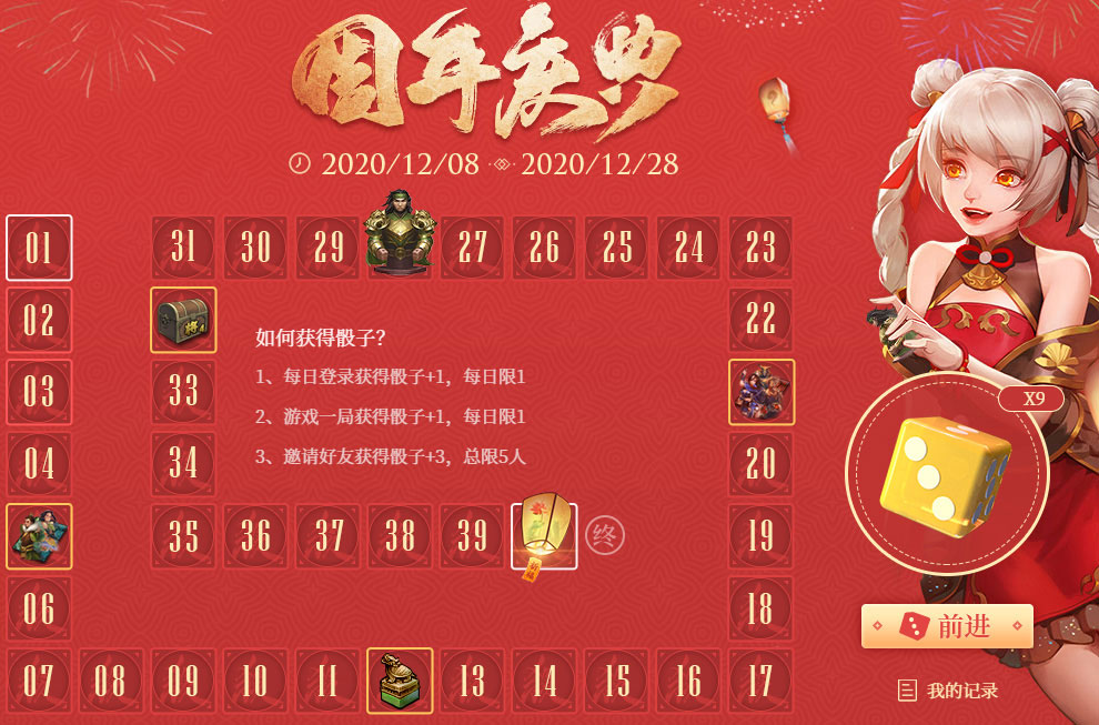 2020年12月8日10时~2020年12月28日24时,活动期间登录、对局、邀请好友均可获得周年骰子,每一步均可获得游戏道具奖励,通关地图还可获得祈福灯、豪华皮肤包、感恩祈福动态秀套装、武将界·孙坚。