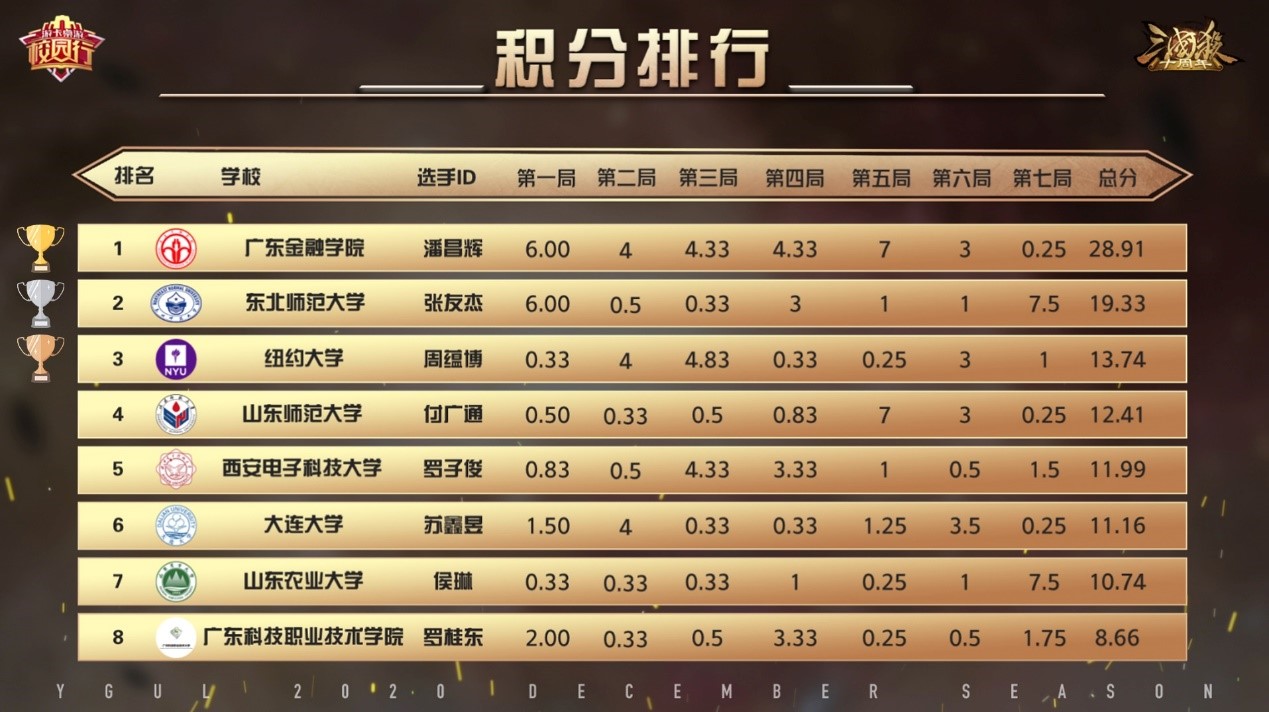 在12月赛季的国战模式中,广东金融学院的潘昌辉同学获得冠军,东北师范大学的张友杰同学获得亚军,纽约大学的周蕴博获得季军。