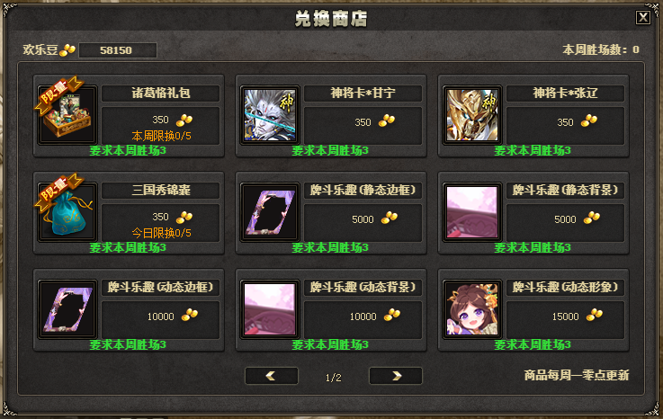 2、智斗三国兑换商店限购条件调整为:”本周胜场>=xx方可兑换奖励 “,且每个商品单独限制胜场数。同时限制逃跑期间账号不可兑换商店道具。
