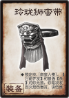玲珑狮蛮带 | 装备/防具 | 当其他角色使用牌指定你为唯一目标后,你可以进行一次判定,若判定结果为红桃,则此牌对你无效。 |