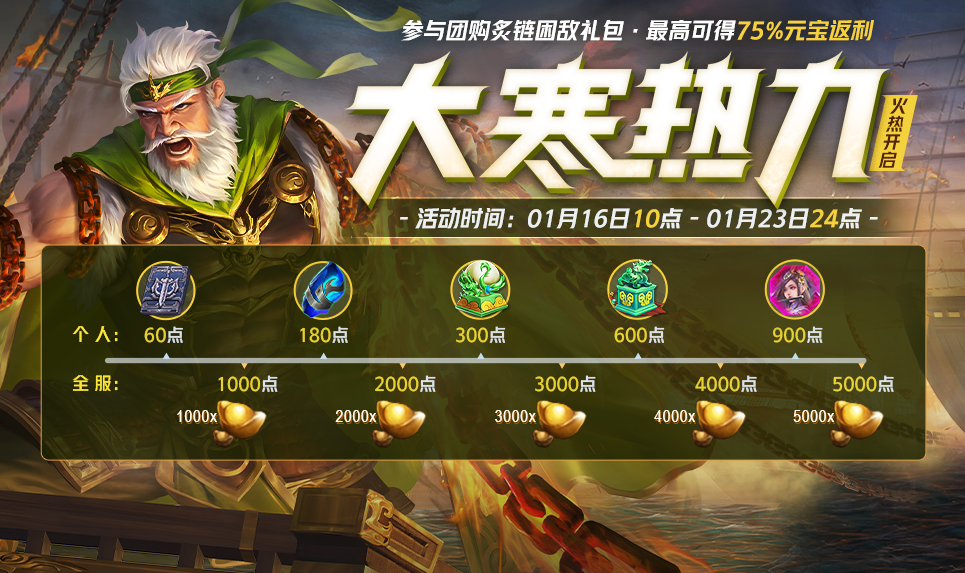 2、2022-01-16 10:00:00~2022-01-23 23:59:59炙链困敌礼包:炙链困敌*界黄盖 售价:20000元宝 (累计限购1次,不可赠送,不可使用抵价券)