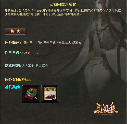 任务描述:武将廖化即将登录银两商城,2014年6月20日-6月26日之间使用廖化完成5场比赛可以获得2000元宝抵1000元宝的抵价券一张(时限截至2014年12月31日)。