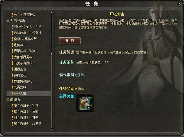 凡在2014年7月3日-7月6日期间,首次购买五联豪华皮肤包即可完成相关任务获赠五个简装单包