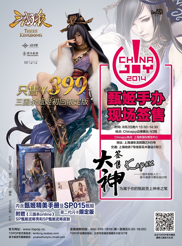 2014年8月2日,在上海ChinaJoy现场将举行Kayak甄姬手办签售会,想收藏手办的杀友们可以与大神面基咯!甄姬首发北京鼓楼见面会未能到场的朋友,这次可不要错过哦!