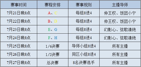 7月25日晚8点,各导师麾下两只队伍将进行残酷的内部之战,决出四名玩家!他们将面临同区另一位导师麾下精兵强将的挑战,争夺本区的出线权,最终和其他大区同台竞技,制霸全区!