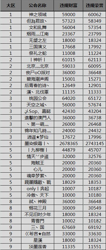 具体涉及大区、公会名称、违规财富和违规荣誉如下: