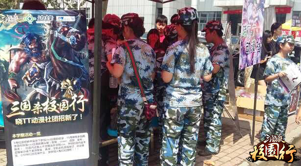 南京信息工程大学滨江学院晓TT动漫社招新:正午军训的空隙,身着迷彩的新生们踊跃加入。