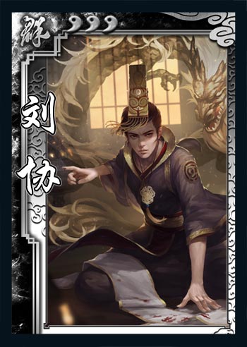 曹操挟天子以令诸侯,此处的“天子”便指的是汉献帝——刘协。这位汉朝的末帝也曾暗中递出血诏试图摆脱曹操的控制,奈何造化弄人为曹操所识破。在三国杀中,刘协是一个集支援和防御于一身的武将。“天命”让刘协拥有针对【杀】的防御力,虽然不稳定,但在没有手牌的情况下能够瞬间获得两牌差。“密诏”是一个强力的支援技能,将所有手牌交给己方角色配合拼点出【杀】的效果可以对敌人形成极高的压制,而“天命”的存在使其可以没有顾忌地发动“密诏”。刘协的使用需要技巧,在必要的时候可以给敌人一牌来让敌人互相残杀。