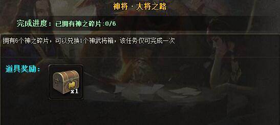 集满6个碎片可兑换神武将箱一个。"神将·大将之路"为长期任务,仅可完成一次。完成后可开启"神将·碎片回收"任务,一个神之碎片可兑换500银两。