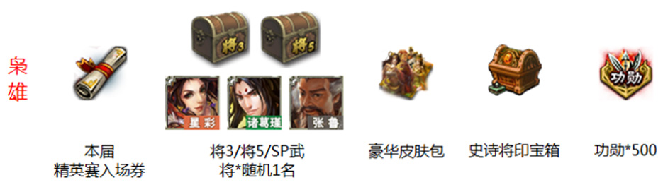 | 枭雄专属奖励 | 4v4或统率排位达到枭雄级别 | 周瑜*枭雄段位秀31天,枭雄的信物x1,枭雄聊天泡泡31天 |