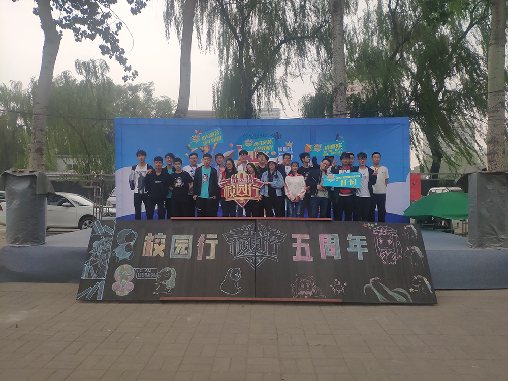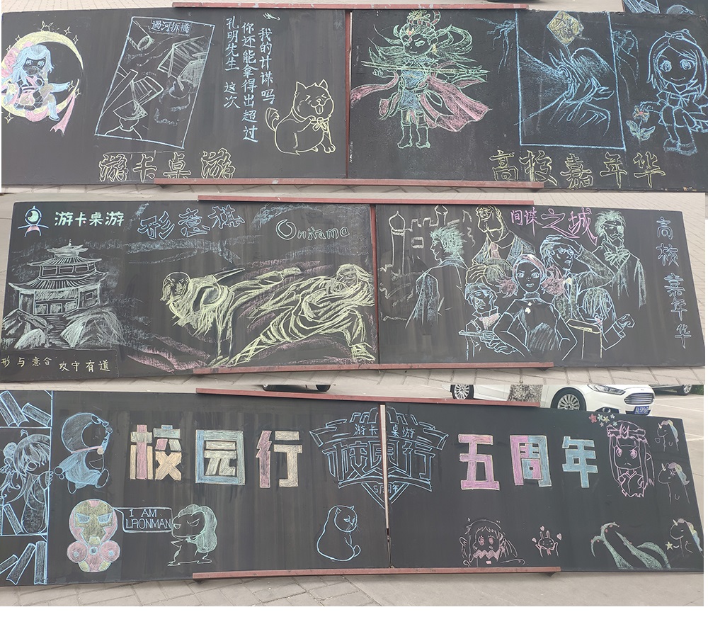 由山西工职的同学们特别设计的黑板,内容包括了校园行五周年、游卡桌游的三国杀、形意棋、间谍之城等产品形象。活动现场还有几名同学直接表演了一段灵魂COS摆拍。