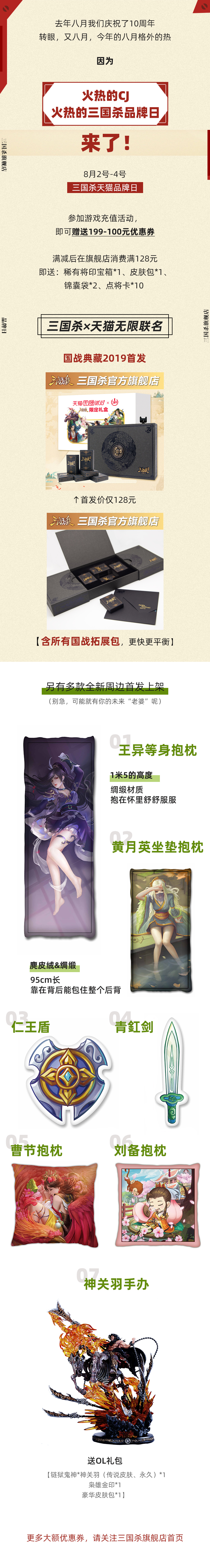 在三国杀天猫品牌日期间充值任意金额的玩家,将有机会获得天猫商城199-100优惠券,参与三国杀旗舰店相关商品的折扣活动;在天猫旗舰店购买三国杀周边,还可获得三国杀OL限定礼包码哦!