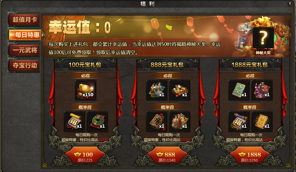 *购买100元宝礼包,888元宝礼包、1888元宝礼包分别可获得1点、3点、5点幸运值;