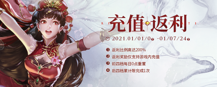 1月1日0点-1月7日24点,累计完成每日充值(二)7次,可以获得【玉颜双娇宝箱】*3,【端瑞洛水宝箱】*3,【夙尚祈新宝箱】*3,累计限完成1次