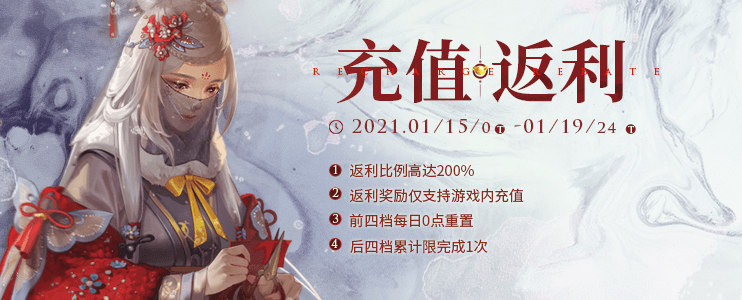 1月15日0点-1月19日24点,累计完成每日充值(二)2次 【月夜情满宝箱】*1,【蜀川锦绣宝箱】*1,【花月福智宝箱】*1,累计限完成1次