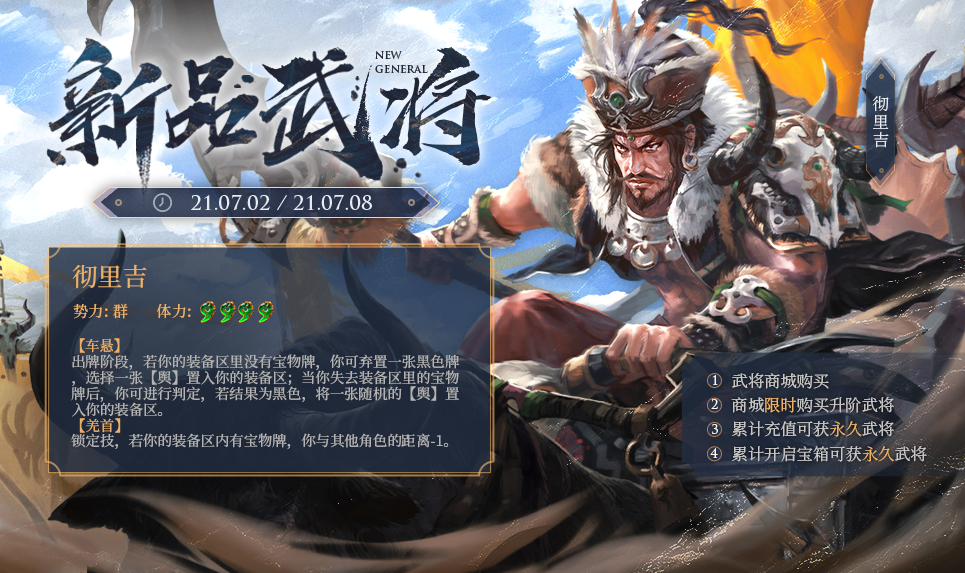 2021-07-02 10:00:00起,彻里吉上架武将商城 ,定价:5500元宝