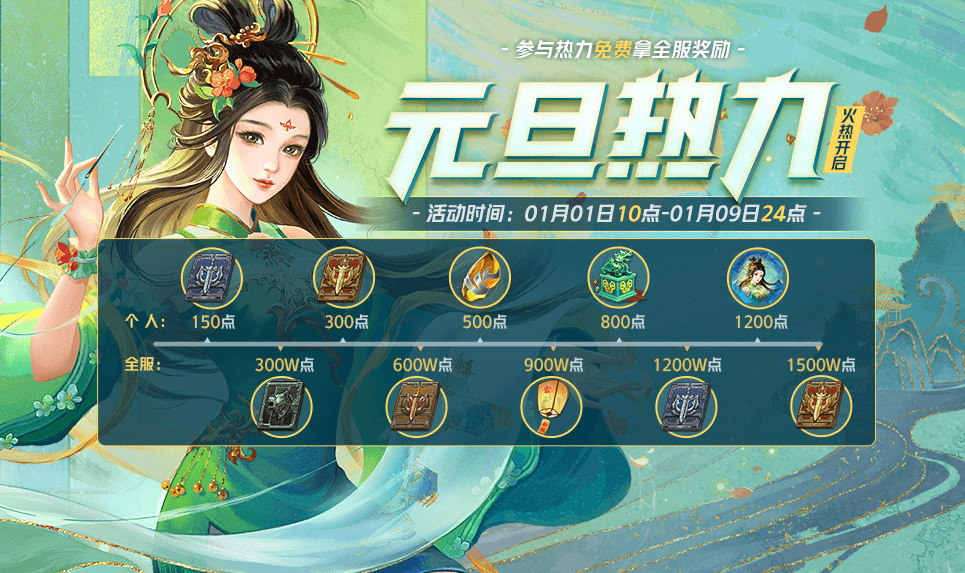 个人热力达到30点可领取全服第一档奖励,个人热力值达到60点可领取全服第二档奖励,个人热力值达到90点可领取全服第三档奖励,个人热力值达到120点可领取全服第四档奖励,个人热力值达到150点可领取全服第五档奖励